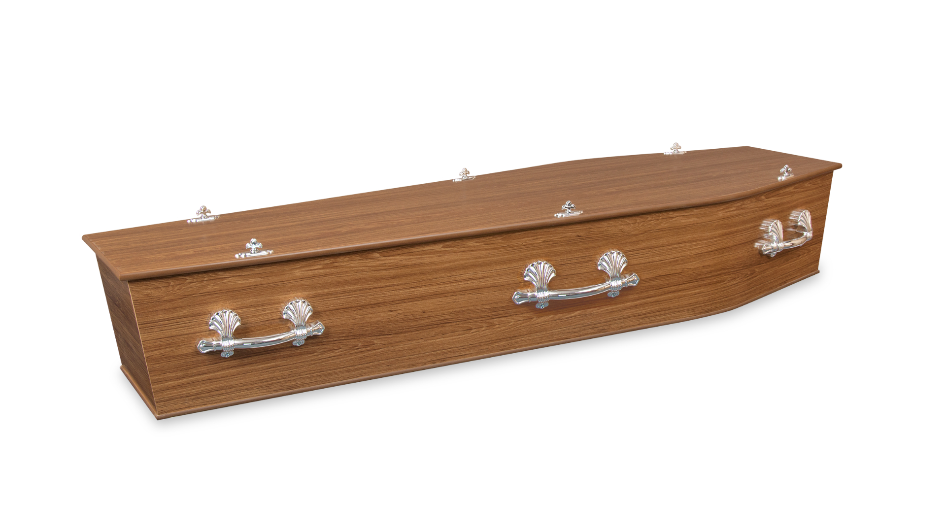 • Australian made coffin • Paper veneered composite board • Teak colour, satin finish • Fixed plastic handles • Cotton lining